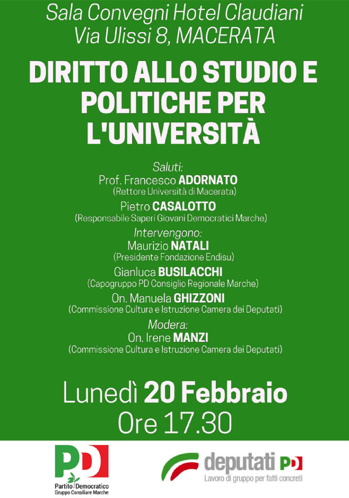 Eventi172Diritto allo studio e politiche per l’UniversitàBy Irene Manzi19 febbraio 20178 marzo 2017 Sala Convegni Hotel Claudiani, Via Ulissi 8 Macerata Lunedì 20 Febbraio 2017 ore 17:30 Moderatrice: On. Irene Manzi